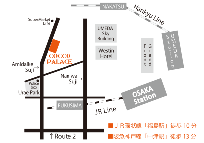 COCCO PALACEの最寄りの高速出口は阪神高速3号神戸線は「海老江」出口、11号池田線は「福島」出口、環状線ご利用の場合は池田線に入り「梅田」出口が最寄りとなります。いずれも一般道に降り、あみだ池筋へお入りください。